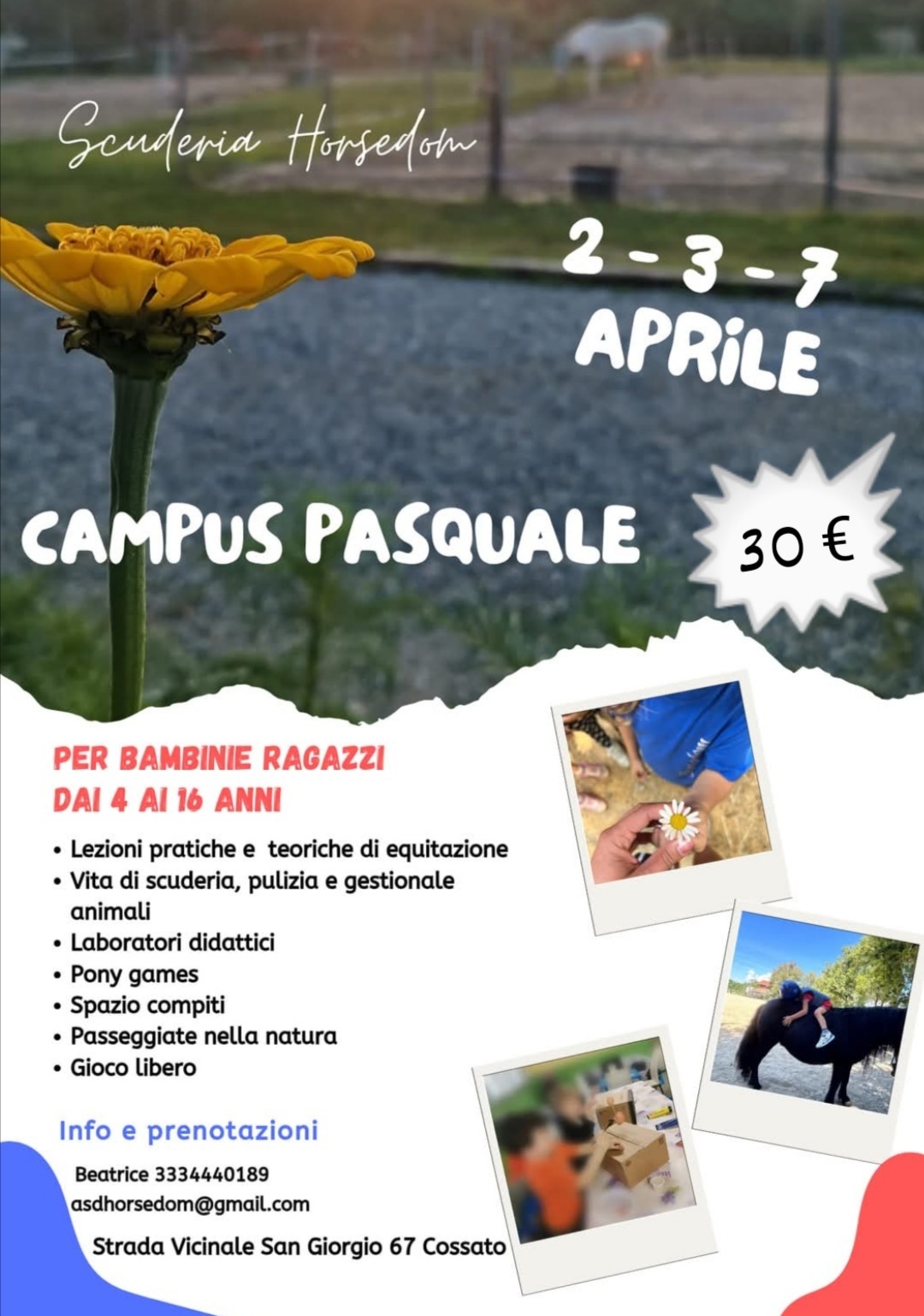 Scuderia situata in provincia di Biella organizza un Campus di Pasqua nelle giornate 2 - 3 - 7 Aprile! L'attività è rivolta a bambini e ragazzi e prevede esperienze educative e ricreative a contatto con la natura.