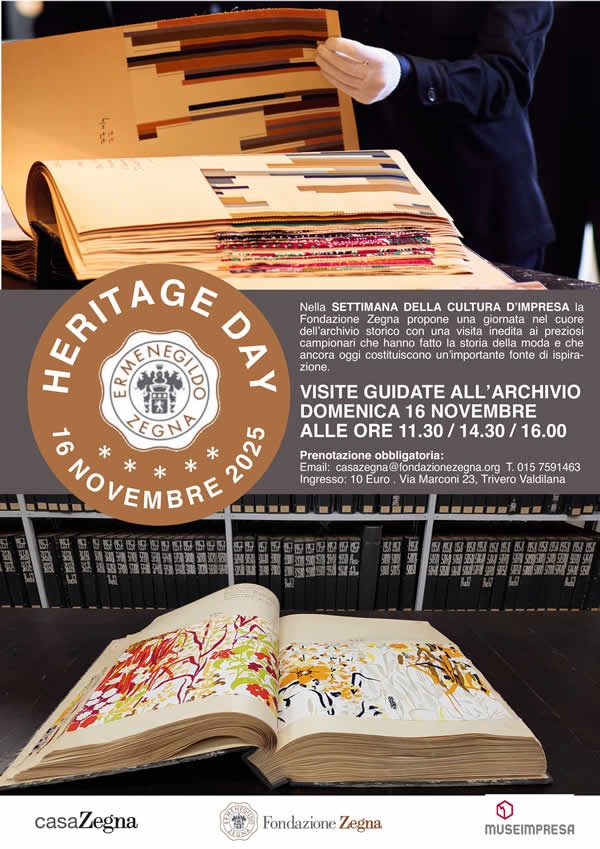 Domenica 16 novembre Casa Zegna apre eccezionalmente le porte del proprio archivio per una nuova edizione dell’Heritage Day, in occasione della Settimana della Cultura d’Impresa (14–28 novembre 2025) promossa da Museimpresa e dedicata quest’anno al tema “Raccontare l’intraprendenza. Per fare crescere le imprese aperte e connesse”.