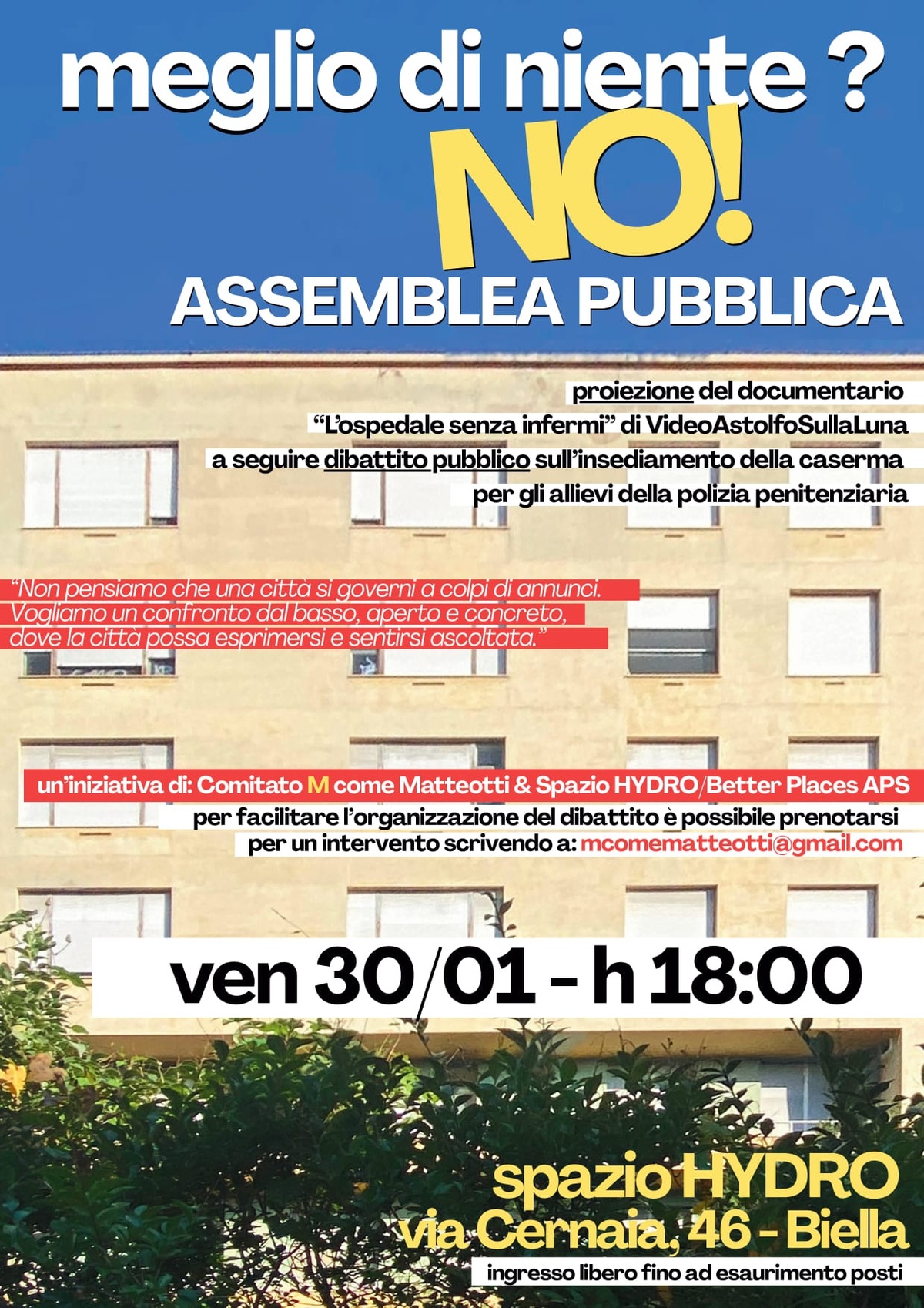 Un incontro pubblico preceduto dalla proiezione del documentario "L'Ospedale senza Infermi" di Beppe Anderi, Filippo Loro, Roberto Miglietti, Maurizio Pellegrini. L’incontro nasce con l’obiettivo di aprire uno spazio di confronto serio e strutturato attorno alla proposta di destinare l’area dell’ex ospedale di Biella alla Scuola di Polizia Penitenziaria. Il momento di discussione non è pensato come una semplice raccolta di opinioni individuali o di preferenze personali sul futuro dell’area, né come una contrapposizione tra alternative puntuali (“questo sì / questo no”). Al contrario, l’intento è favorire interventi che contribuiscano a una riflessione collettiva più ampia, fondata su alcuni modi centrali: Il metodo delle decisioni pubbliche e il rapporto tra istituzioni, territorio e comunità, La visione di città, oltre le scadenze elettorali e le soluzioni di breve periodo, l’impatto complessivo delle scelte sulla qualità della vita, sul tessuto sociale, economico e commerciale.