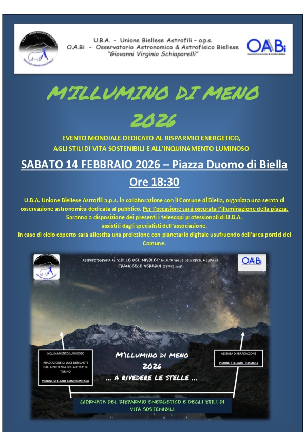 In occasione della giornata dedicata al risparmio energetico e alla riduzione del livello d'illuminazione, l'U.B.A. (Unione Biellese Astrofili) propone un'osservazione del cielo in condizioni di inquinamento luminoso ridotto.
