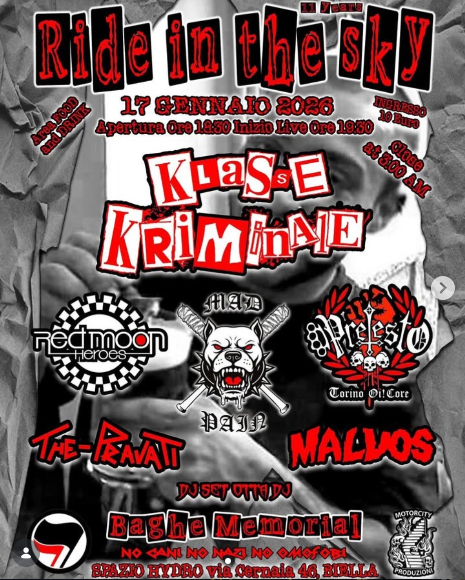 Questo è un’evento memorial dell’undicesimo anno dalla scomparsa del nostro amico Baghe, suoneranno per voi 6 band pronte per farvi saltare e pogare, ci saranno banchetti distro e buon cibo e per finire un dj set! Non potete mancare! Ricchi premi e cotillon! No nazi No cani No omofobi!