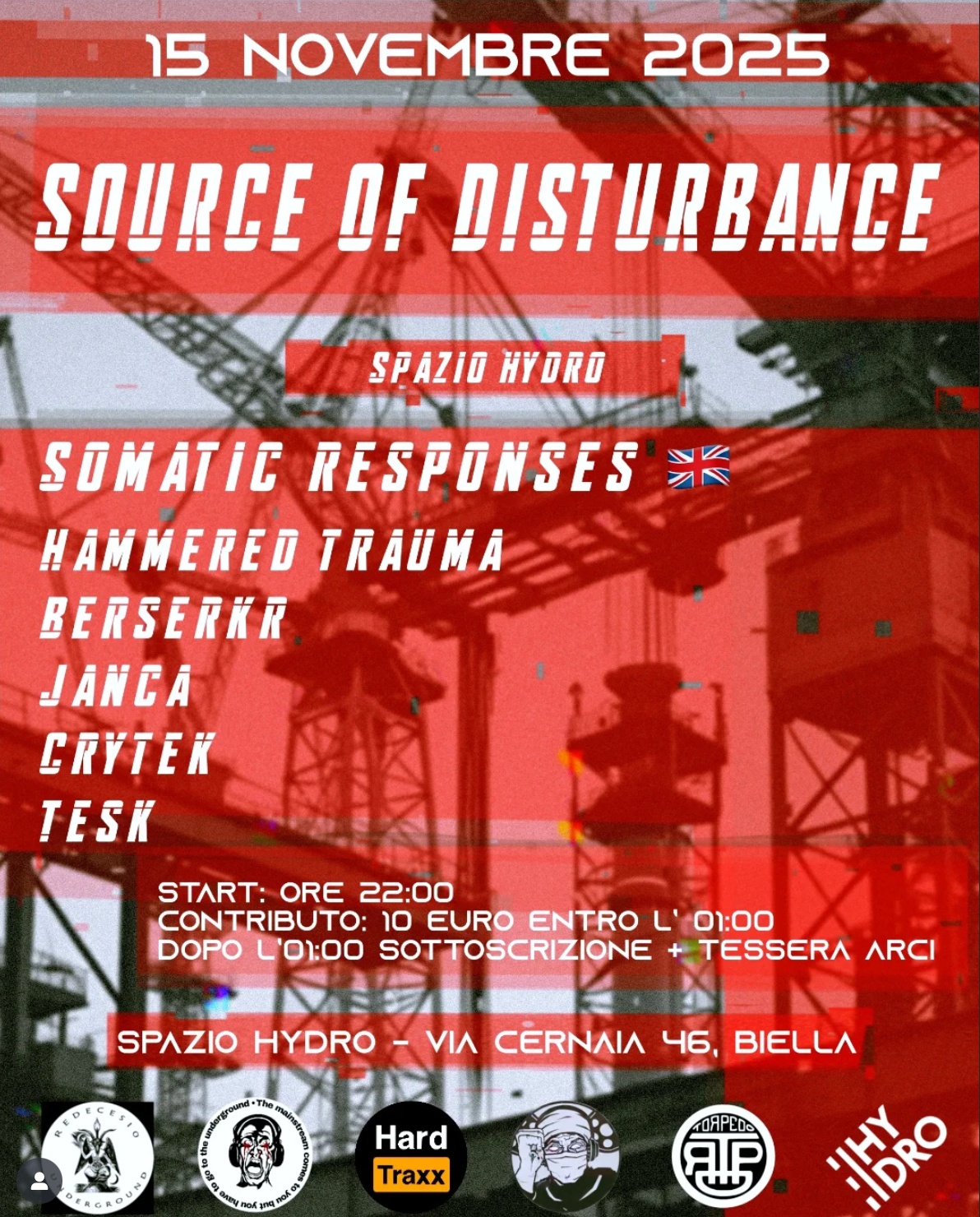 Dopo il successo di EVENT HORIZON, evento che ha dato vita alla collaborazione tra @hardtraxxofficial@concrete.jungle.events @redecesio_underground@speedlife07narkan @aneurysm_recordings e @spaziohydro , siamo orgogliosi di invitarvi a SOURCE OF DISTURBANCE, nuova data all'insegna della musica elettronica underground!